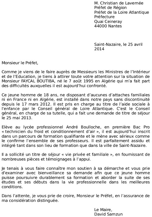 D. Samzun, maire de Saint-Nazaire, écrit aux ministres de l’Intérieur et de l’Education ainsi qu’au préfet des Pays de la Loire pour attirer leur attention sur la situation de Fayçal, leur faire connaître son soutien et leur demander d’examiner sa demande avec bienveillance.