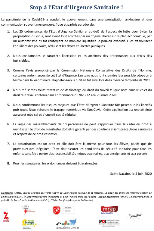Au-delà de l’aspect de lutte pour éviter la propagation du virus, les 25 ordonnances de l’Etat d’Urgence Sanitaire, doivent être abrogées.