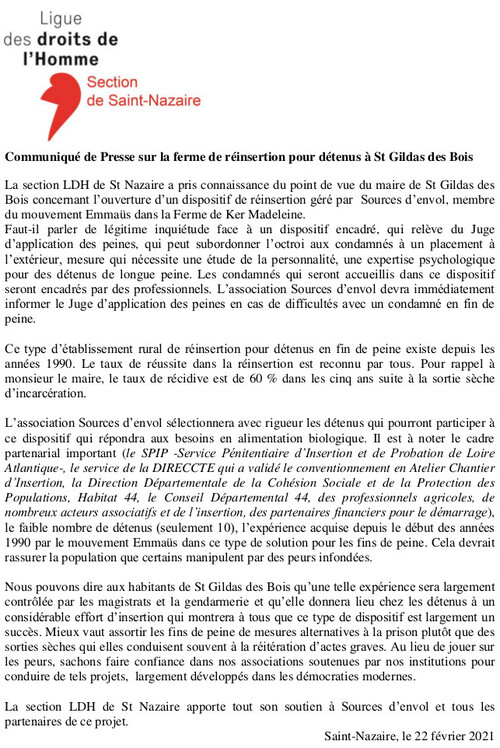 Nous publions ici le communiqué de la section locale de la LDH à propos de la ferme de réinsertion pour détenus de Saint—Gildas-des-Bois, gérée par Sources d’envol du mouvement Emmaüs et des inquiétudes que son installation suscite. Nous en partageons les termes.