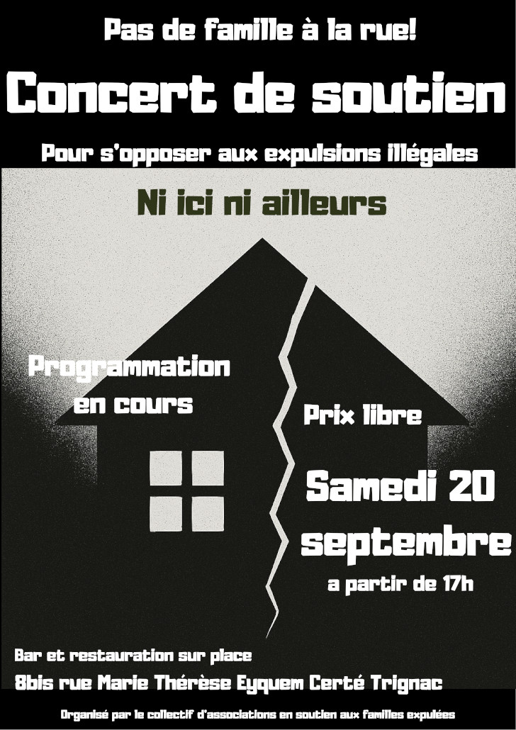 Le Collectif des familles expulsées, en collaboration avec La Soupe aux Cailloux 44, organise un concert solidaire le samedi 20 septembre à partir de 17h.