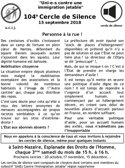 [UCIJ] 104ème cercle de silence : Personne à la rue !
