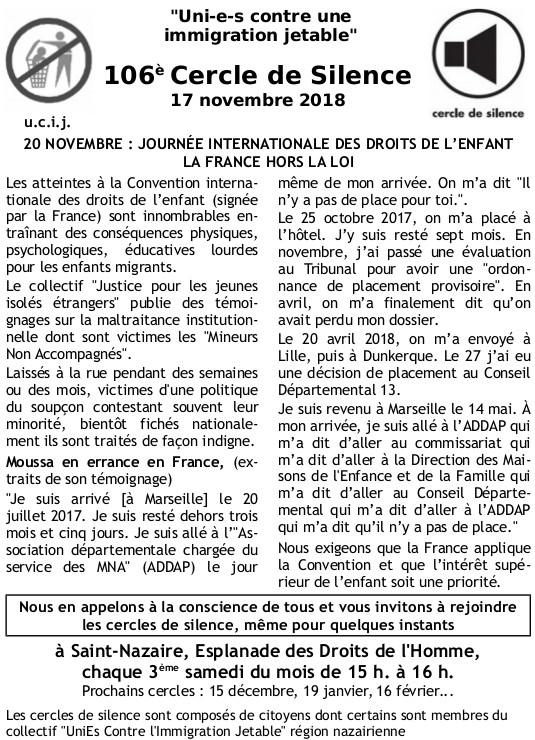 [UCIJ] 106ème cercle de silence : 20 novembre, journée internationale des droits de l’enfant : la France hors la loi