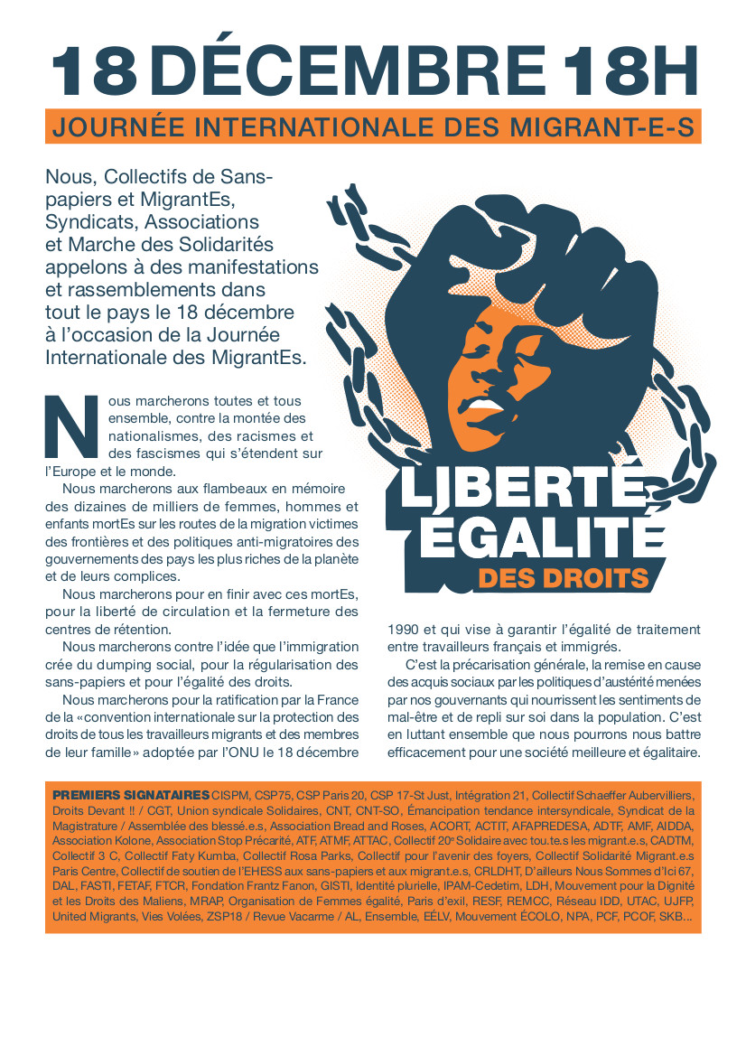 Nous appelons à des manifestations et rassemblements dans tout le pays à l’occasion de la Journée Internationale des MigrantEs.