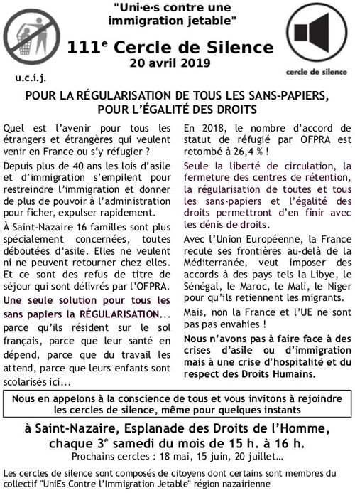 [UCIJ] 111ème cercle de silence : Pour la régularisation de tous les sans-papiers, pour l’égalité des droits