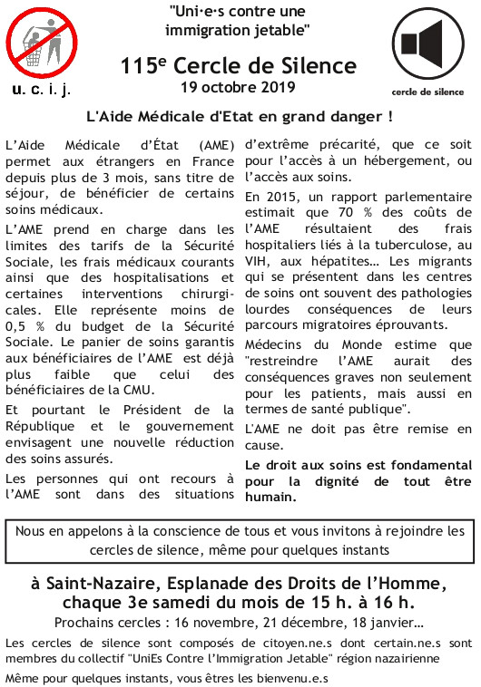 [UCIJ] 115ème cercle de silence : L’Aide Médicale d’État en grand danger !