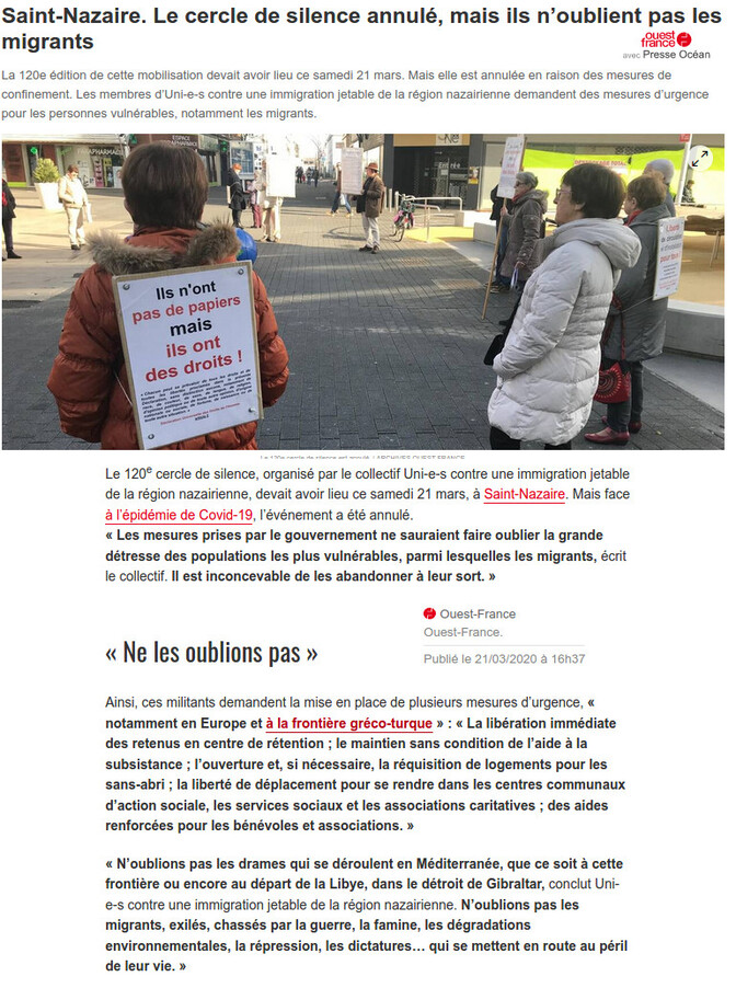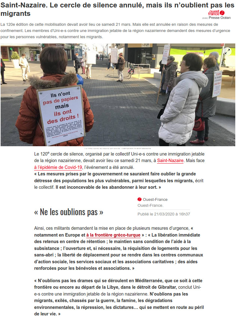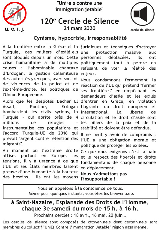Le rassemblement du cercle de silence du samedi 21 mars 2020 est annulé.