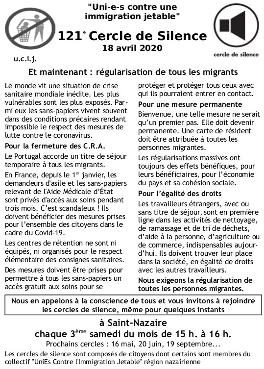 [UCIJ] 121è cercle de silence : Et maintenant : régularisation de tous les migrants