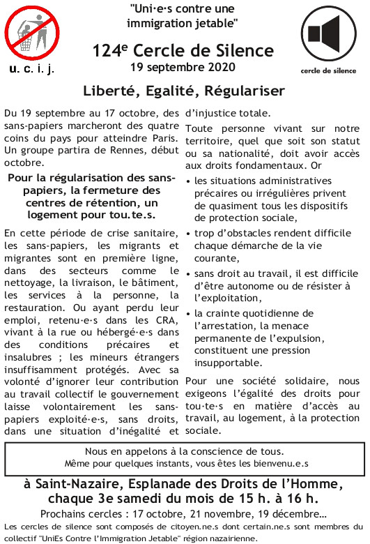 [UCIJ] 124ème cercle de silence : Liberté, Egalité, Régulariser