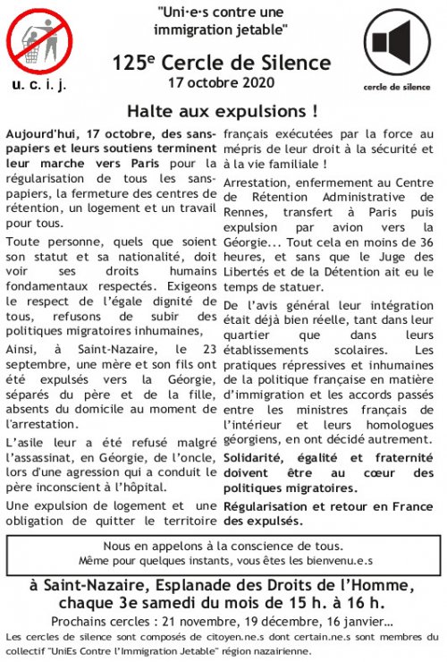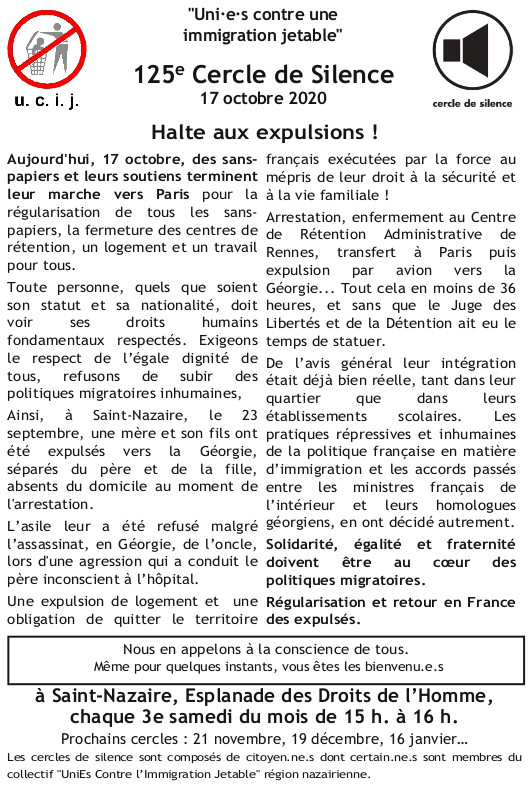 [UCIJ] 125è cercle de silence : Halte aux expulsions !