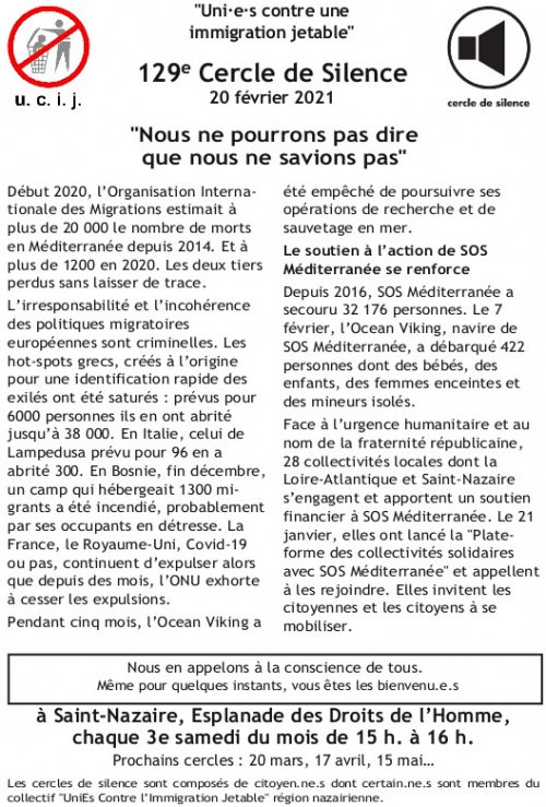 [UCIJ] 129è cercle de silence : Méditerranée, "Nous ne pourrons pas dire que nous ne savions pas"