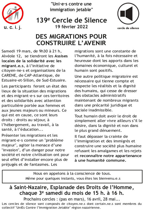 Accueil > Migrations > Cercles de silence > [UCIJ] 139è cercle de silence : Des migrations pour construire l’avenir