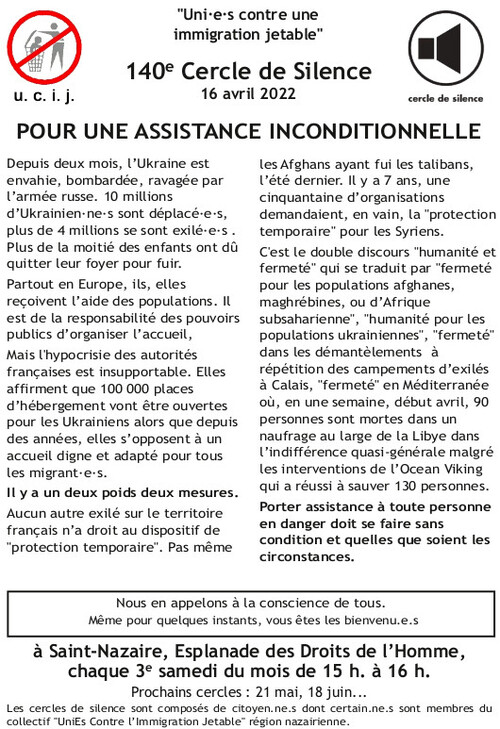 Accueil > Migrations > Cercles de silence > [UCIJ] 140è cercle de silence, pour une assistance incondtionnelle