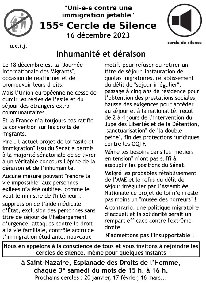 [UCIJ] 155è cercle de silence : Inhumanité et déraison