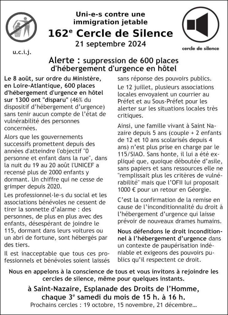 Accueil > Migrations > Cercles de silence > [UCIJ] 162è cercle de silence : Alerte, suppression de 600 places (…)
