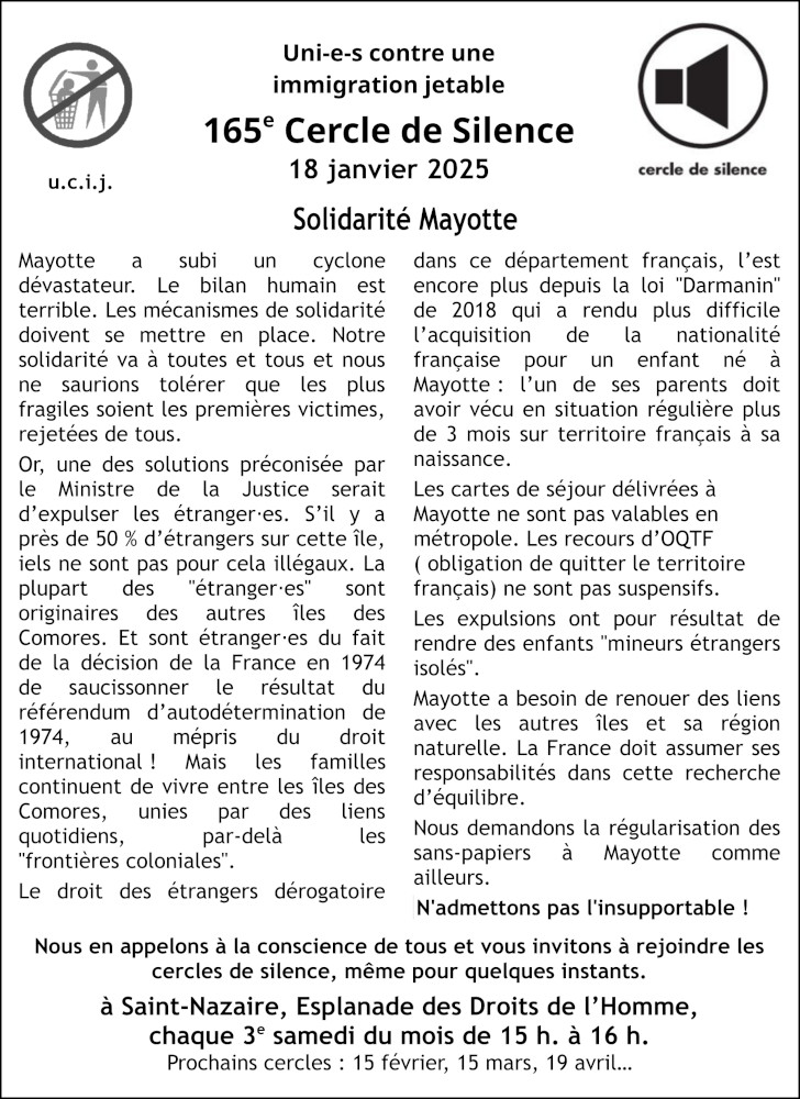 Accueil > Migrations > Cercles de silence > [UCIJ] 165è cercle de silence : Solidarité avec Mayotte