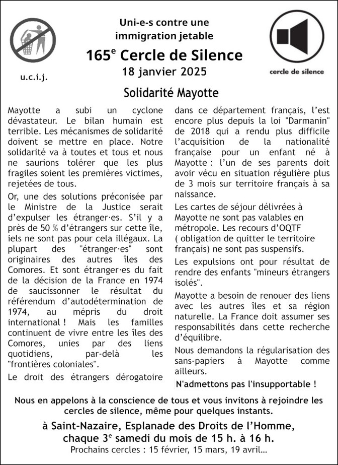 [UCIJ] 165è cercle de silence : Solidarité avec Mayottesamedi 18 janvier 2025