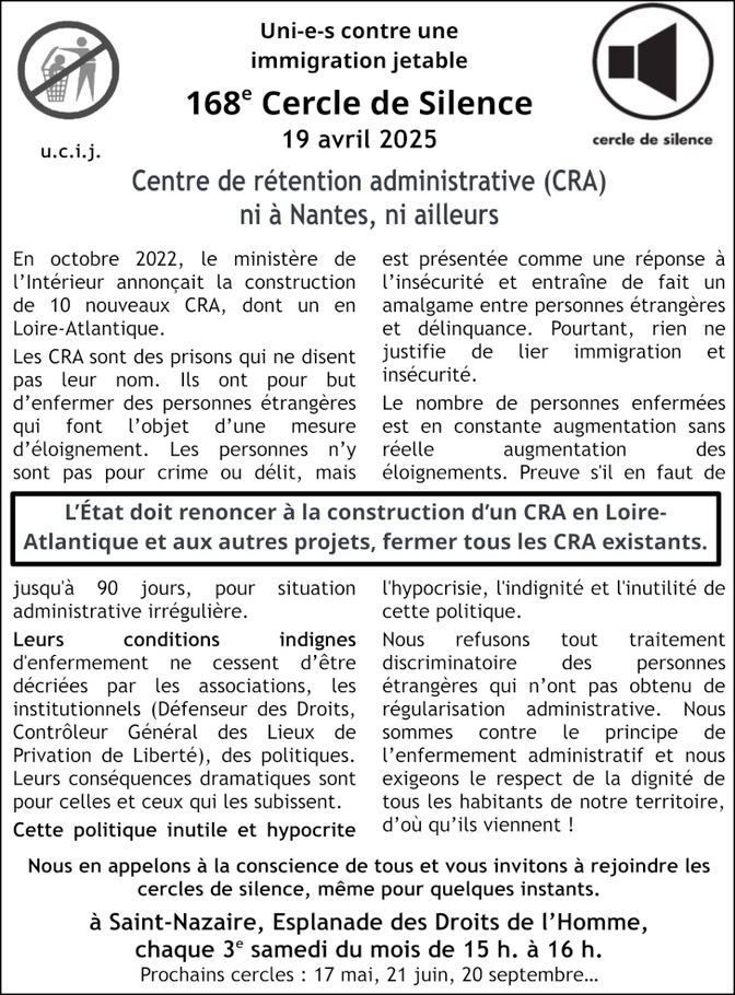 [UCIJ] 168è cercle de silence : Centre de rétention administrative (CRA), ni à Nantes, ni ailleurs