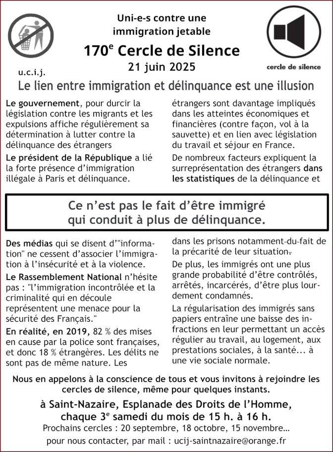 [UCIJ] 170è cercle de silence : Le lien entre immigration et délinquance est une illusion