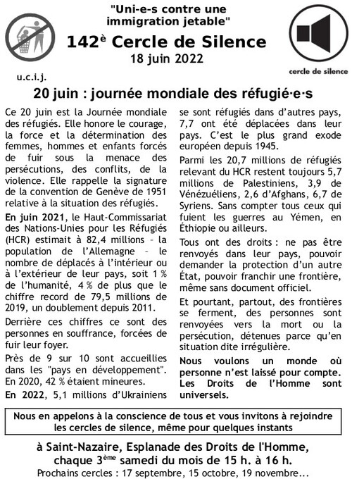 Accueil > Migrations > Cercles de silence > [UCIJ] 20 juin : journée mondiale des réfugié.e.s