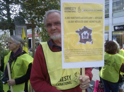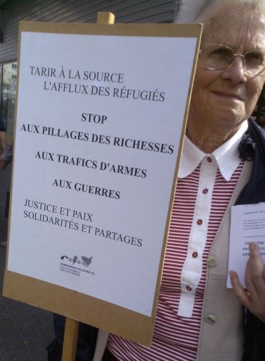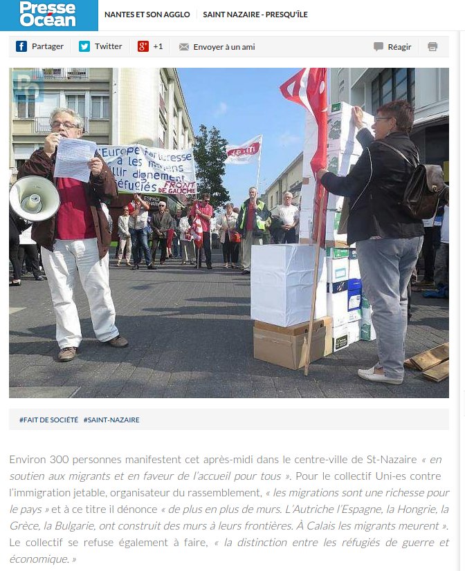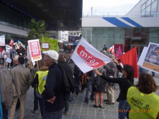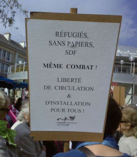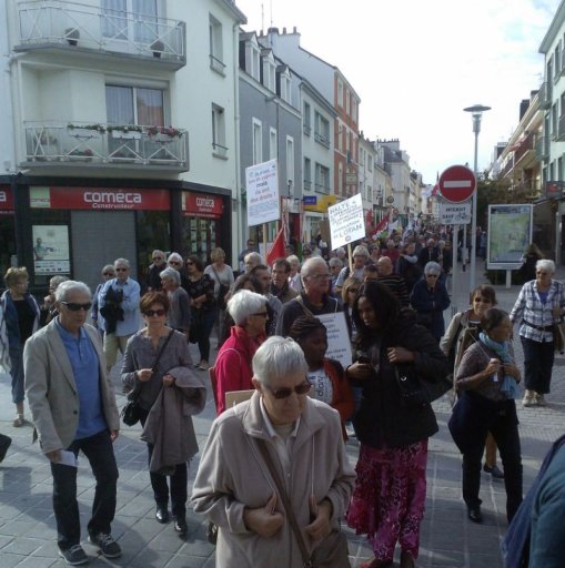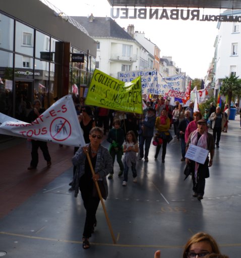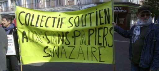 Le cortège s’est ensuite dirigé vers la sous – préfecture en scandant des slogans pour une véritable solidarité internationale. A mi-chemin du parcours, une seconde prise de parole au nom du CSPSP (collectif de soutien aux personnes sans papiers) a expliqué la réalité des migrant-e-s déjà présent-e-s à St-Nazaire, leurs difficultés pour pouvoir s’installer librement dans notre ville et y vivre décemment. Enfin, à la sous-préfecture une dernière prise de parole concernait la lettre que l’UCIJ a envoyé au président de la République pour lui signifier nos revendications. La veille, une délégation avait été reçue par le cabinet du sous-préfet auquel cette lettre avait été remise.