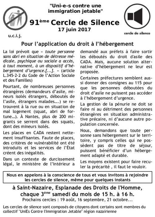 Accueil > Migrations > Cercles de silence > [UCIJ] 91ème cercle de silence : Pour l’application du droit à l’hébergement