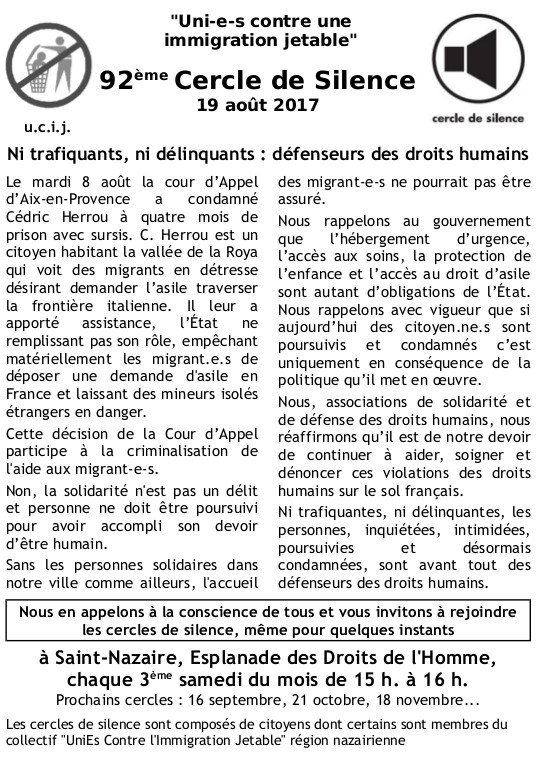 [UCIJ] 92ème cercle de silence : Ni trafiquants, ni délinquants : défenseurs des droits humains