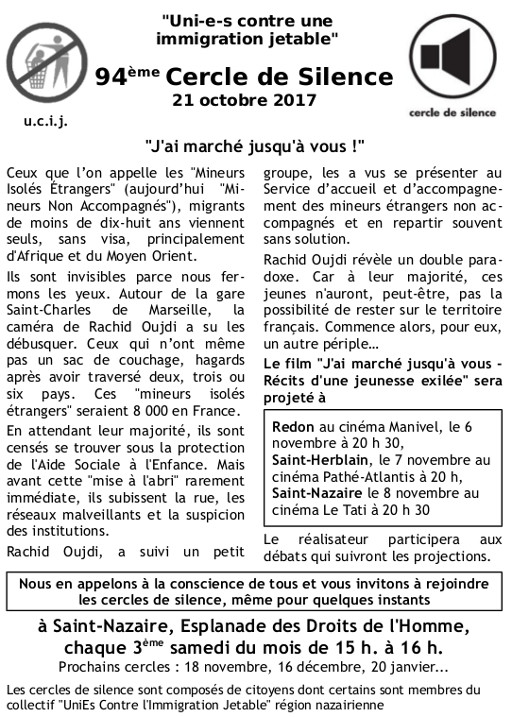 Accueil > Migrations > Cercles de silence > [UCIJ] 94ème cercle de silence : "J’ai marché jusqu’à vous !"