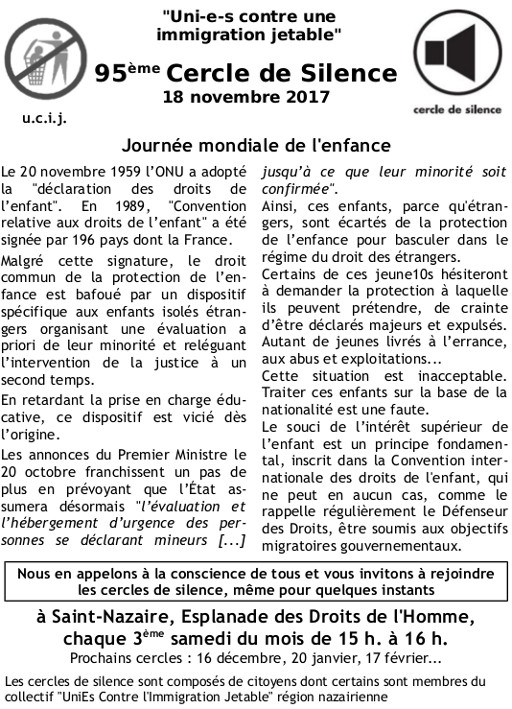 Accueil > Migrations > Cercles de silence > [UCIJ] 95ème cercle de silence : Journée mondiale de l’enfance