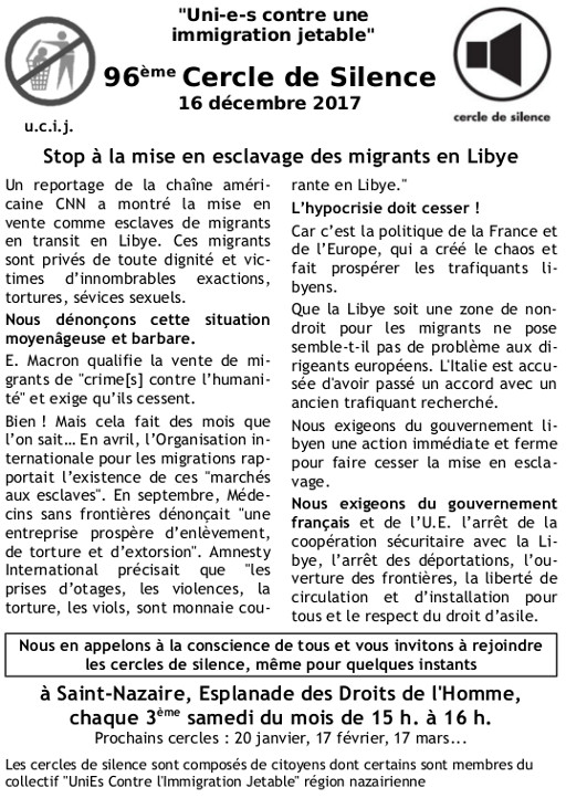 [UCIJ] 96ème cercle de silence : "Stop à la mise en esclavage des migrants en Libye"