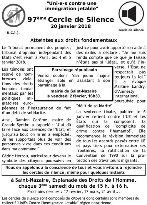 Accueil > Migrations > Cercles de silence > [UCIJ] 97ème cercle de silence : Atteintes aux droits fondamentaux
