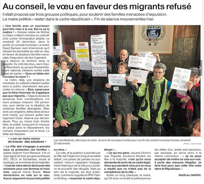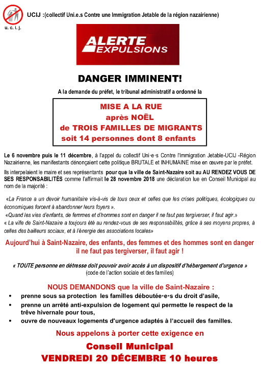Nous demandons que la ville de Saint-Nazaire prenne sous sa protection les familles déboutées du droit d’asile, prenne un arrêté anti-expulsions, ouvre de nouveaux logements d’urgence.
