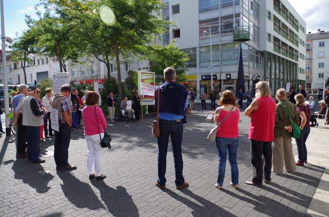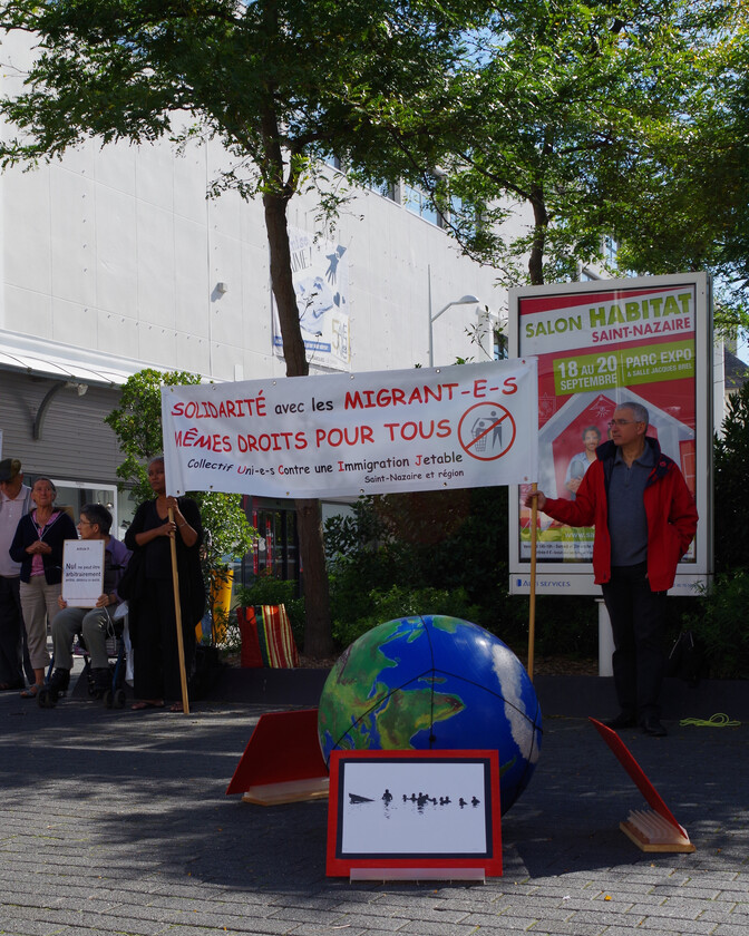 Une soixantaine de personnes ont participé au 70ème cercle de silence samedi 19 septembre de 15 heures à 16 heures, Esplanade des Droits de l’Homme-Nelson Mandela à Saint-Nazaire pour demander la construction de ponts pour accueillir tous les migrants et refuser la construction de murs destinés à les rejeter.