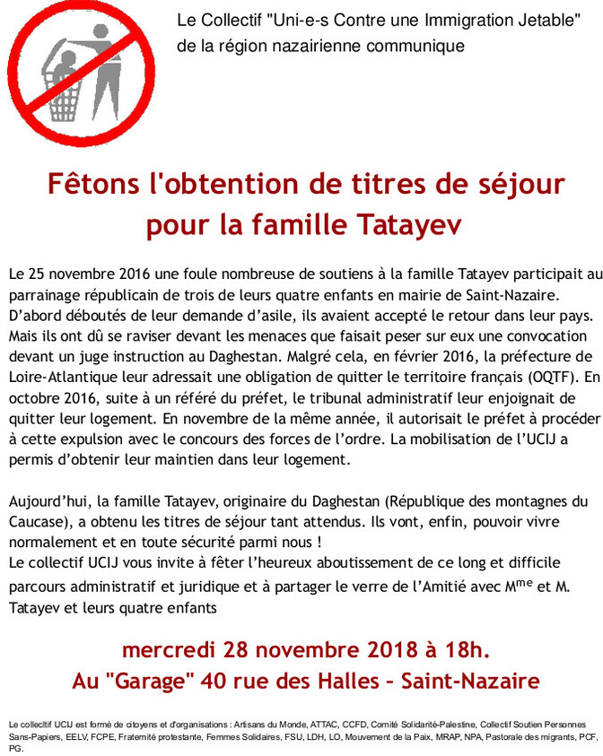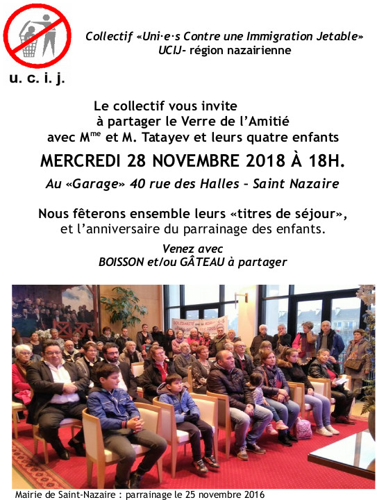 Le Collectif « Uni-Es Contre une Immigration Jetable » UCIJ région nazairienne invite à partager le Verre de l’Amitié avec Mme et M. Tatayev et leurs quatre enfants.