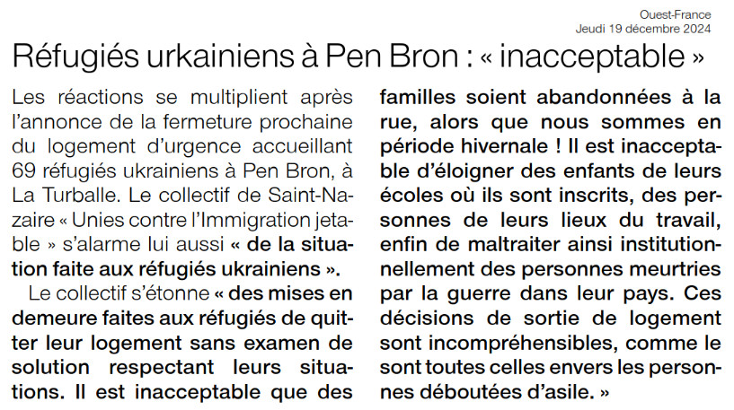 Le Collectif Uni⋅es Contre l’Immigration Jetable UCIJ de la région nazairienne s’alarme de la situation faite aux réfugiés ukrainien⋅nes hébergé⋅es jusqu’alors à Pen Bron (La Turballe) par France Horizon.