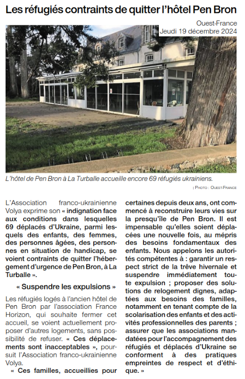 Le Collectif UCIJ s’étonne donc des mises en demeure faites aux réfugié⋅es Ukrainien⋅nes de quitter leur logement à l’hôtel de Pen Bron à la Turballe sans examen de solution respectant leurs situations.
