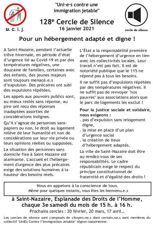 Accueil > Migrations > Cercles de silence > [UCIJ] Pour un hébergement adapté et digne !