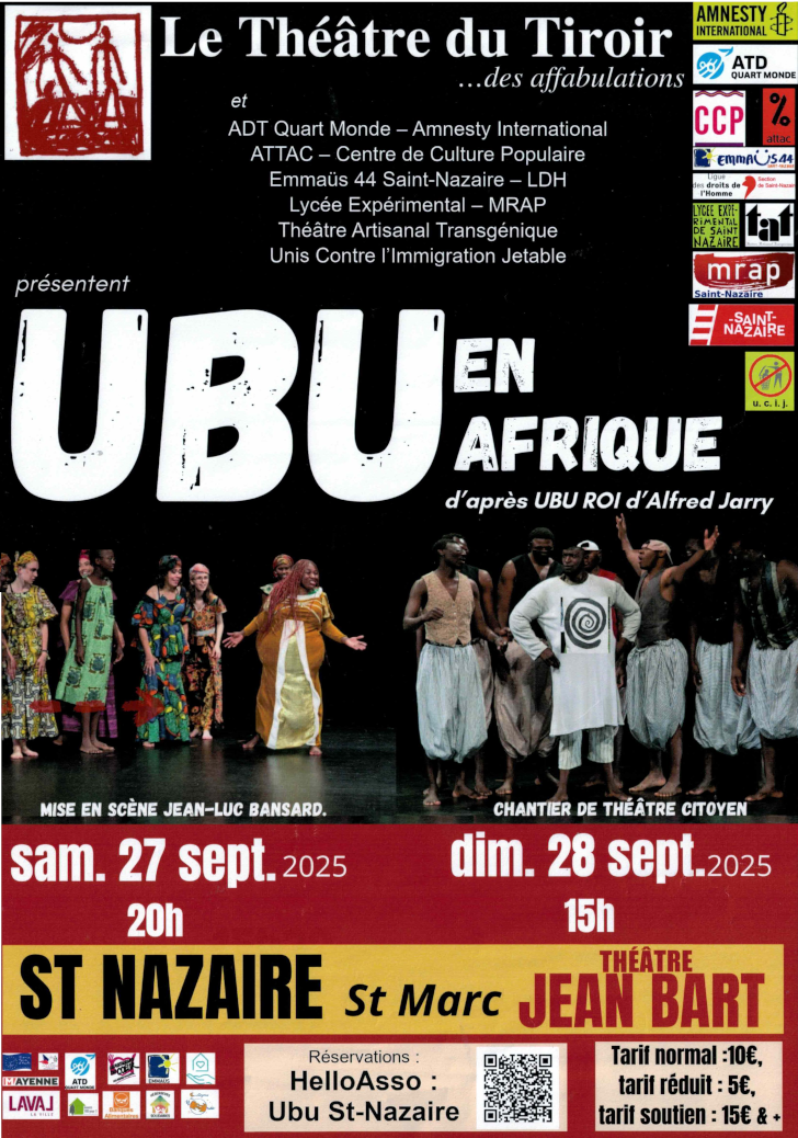 Interprétée en 14 langues par 22 actrices et acteurs amateure.s dont la plupart viennent d’Afrique et sont réfugié.e.s ou demandeurs de refuge en Mayenne, Ubu Roi une nouvelle aventure qui va parfois les ramener dans leur pays d’origine où sévissent de nombreux pères UBU. Après Gaza, Les Suppliantes, Réfugiés poétiques et La Conférence des oiseaux, c’est le 5-ème chantier citoyen de la compagnie du Tiroir pour redire que “Le pays que l’on préfère est la terre entière”