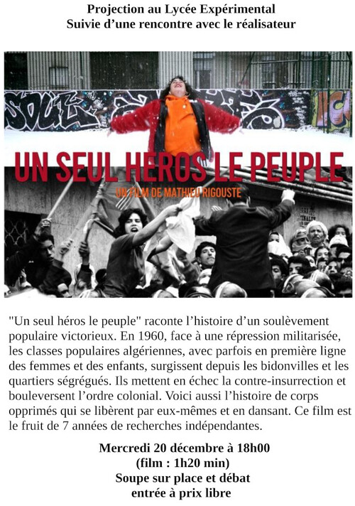 En séance publique : projection du film "Un seul héros le peuple" au Lycée exprimental (17 Boulevard René Coty) le mercredi 20 décembre, 18h en présence du réalisateur Mathieu Rigouste (projection portée par un groupe du Lycée Expérimental)