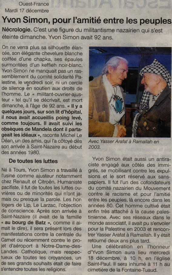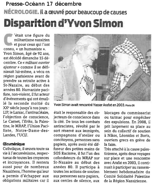 Saint-Nazaire vient de perdre l’une de ses figures militantes majeures : Yvon Simon, âgé de 92 ans, est décédé dimanche 15 décembre. Ce « militant ouvrier ajusteur » comme il se définissait lui-même, a vécu en région parisienne avant de prendre sa retraite active dans notre ville, au début des années 80. Humaniste pacifiste, non-violent, il fut acteur de toutes les luttes qui ont émaillé la seconde moitié du XXème siècle jusqu’à nos jours : LIP, le Larzac, l’antinucléaire, l’Objection de Conscience, Le Carnet, l’Erika, la Palestine, le MRAP, l’Union Pacifiste, Notre -Dame-des-Landes, l’UCIJ.