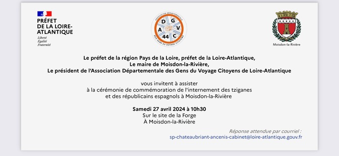 L’Association Départementale des Gens du Voyage Citoyens de Loire-Atlantique invite à la commémoration officielle de l’internement des nomades et des républicains espagnols à Moisdon-la-Rivière, près de Châteaubriant, le samedi 27 avril prochain..