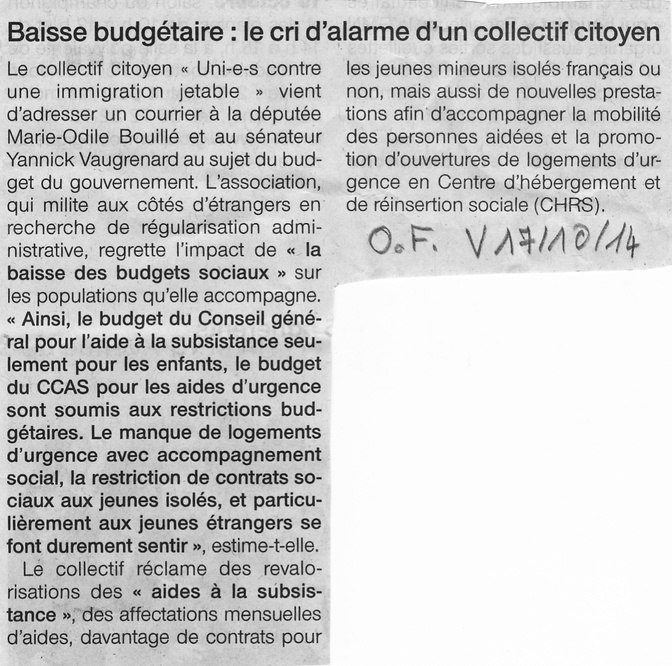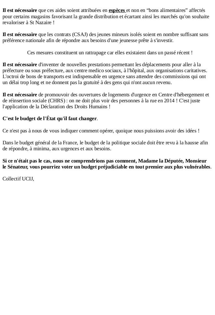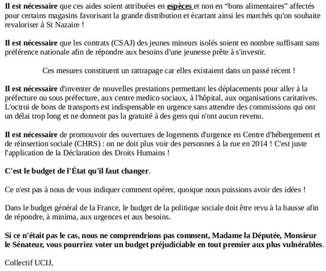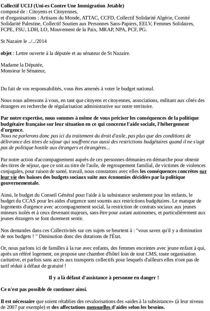Le Collectif UCIJ (Uni-es Contre Une Immigration Jetable) de la région nazairienne a adressé une lettre ouverte à la députée et au sénateur de Saint-Nazaire au sujet du budget du gouvernement et de ses conséquences sur la situation des plus démunis.